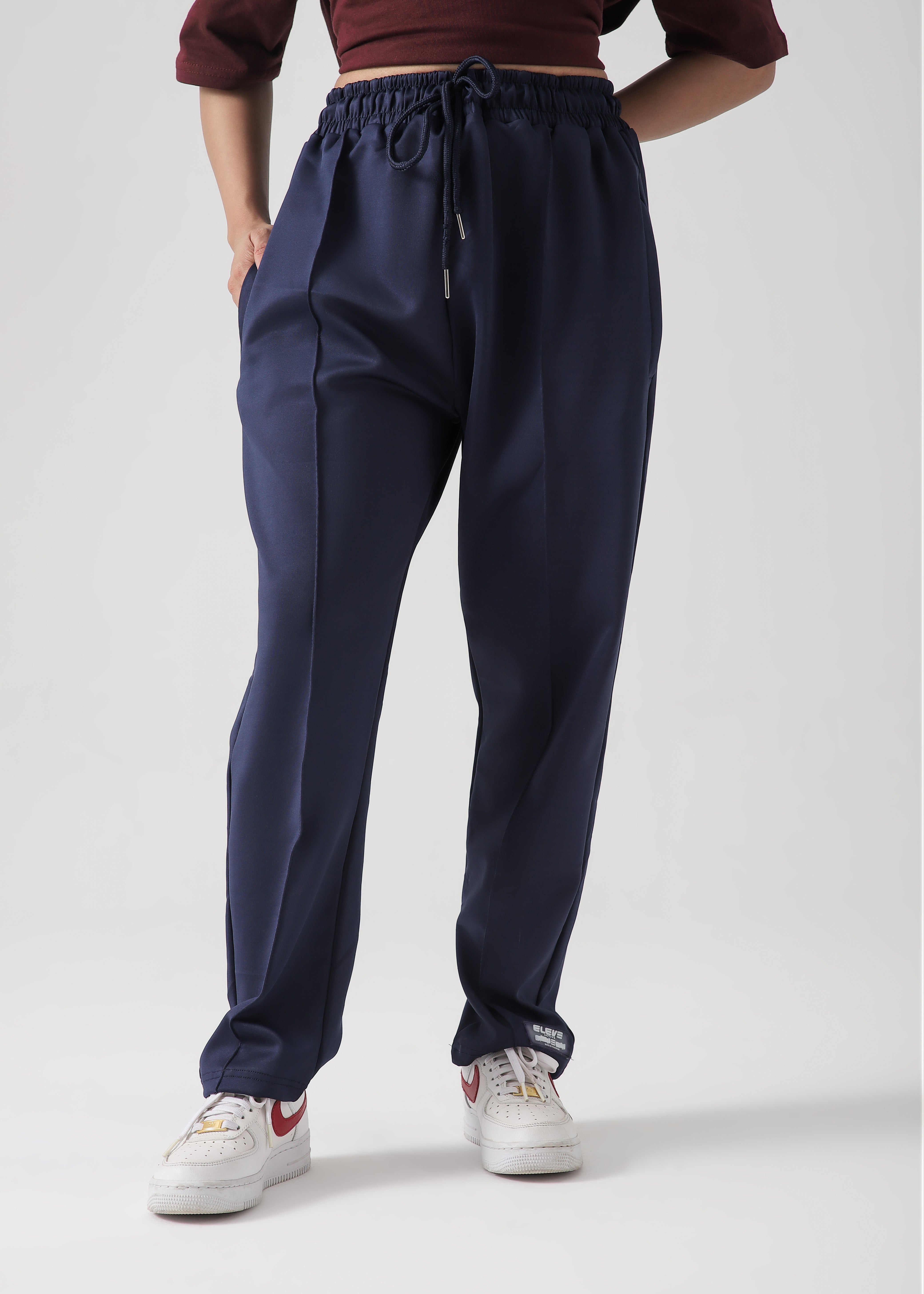 Design details: Relaxed fit trousers with an adjustable elasticated drawstring waistband. Front pockets and back patch pocket. Seam detail on the front of the legs.